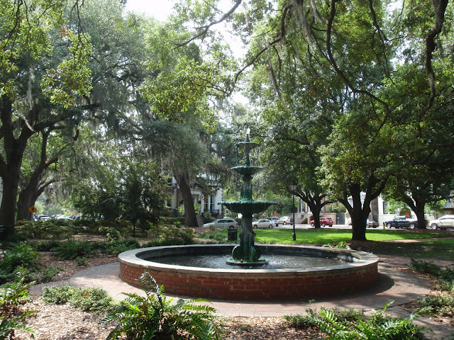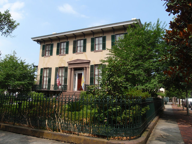 This is the Andrew Low house. Andrew Low emigrated from Scotland and became involved in the cotton business. His success led to him becoming the wealthiest man in Savannah. He had his home built across from Lafayette Square. Henry Makepeace Thackeray was a guest in the home twice while on lecture tours in the States, and Gen. Robert E. Lee was a family friend who stayed there often. In 1886, William Mackay Low inherited his father’s estates in England and America, and six months later married Juliette Gordon, known as Daisy. Juliette Gordon Low was the founder of the Girl Scouts. The home remained in the family until Juliette Low passed away in one of the bedrooms from breast cancer in 1927. A year later it was acquired by a historical organization that has maintained it since.