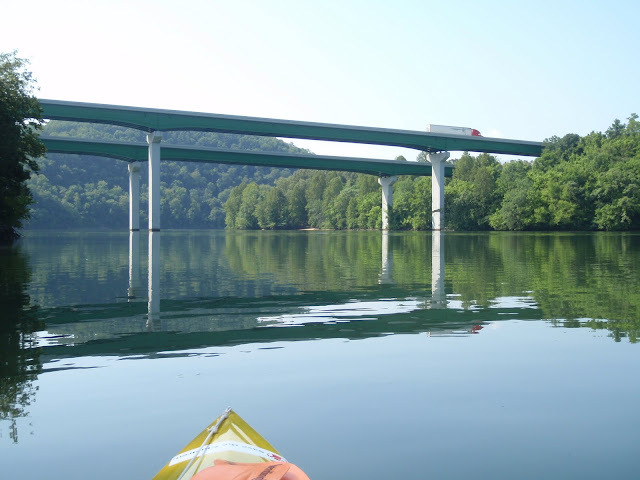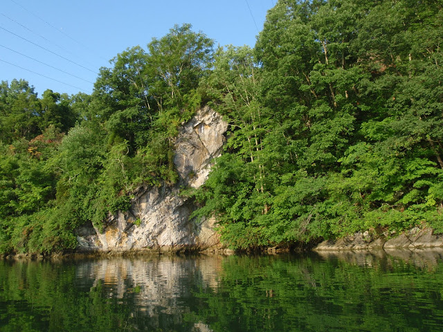 Patrick Henry Lake, at Warriors’ Path State Park, was formed by damming the south fork of the Holston River. There is a dam at either end, and the lake measures close to ten miles from one dam to the other. It is in a deep ravine with sheer walls of rock, some running 200 ft. in height. The water is clear, and a beautiful color of green. I was on the lake for seven hours, and covered 18.2 miles while circumnavigating along the shoreline. I met six other paddlers, two canoes, two SOT’s, and two kayaks, and had the chance to speak with four of the paddlers. The lake is home to a wide array of wildlife. I saw two deer, which stood watching me watch them, many heron, kingfishers, bitterns, brown ducks, Canada geese, and one lone swan. One pair of Canada geese had three goslings, and another had two. While they must have lost several to hawks, turtles, and fish, those remaining are now large enough to improve their chances for survival. On one grass-covered hillside, I counted 48 Canada geese with one lonely white domestic goose crashing the party. As for ducklings, it would be no exaggeration to say that if I didn’t see a hundred, it was darn close.