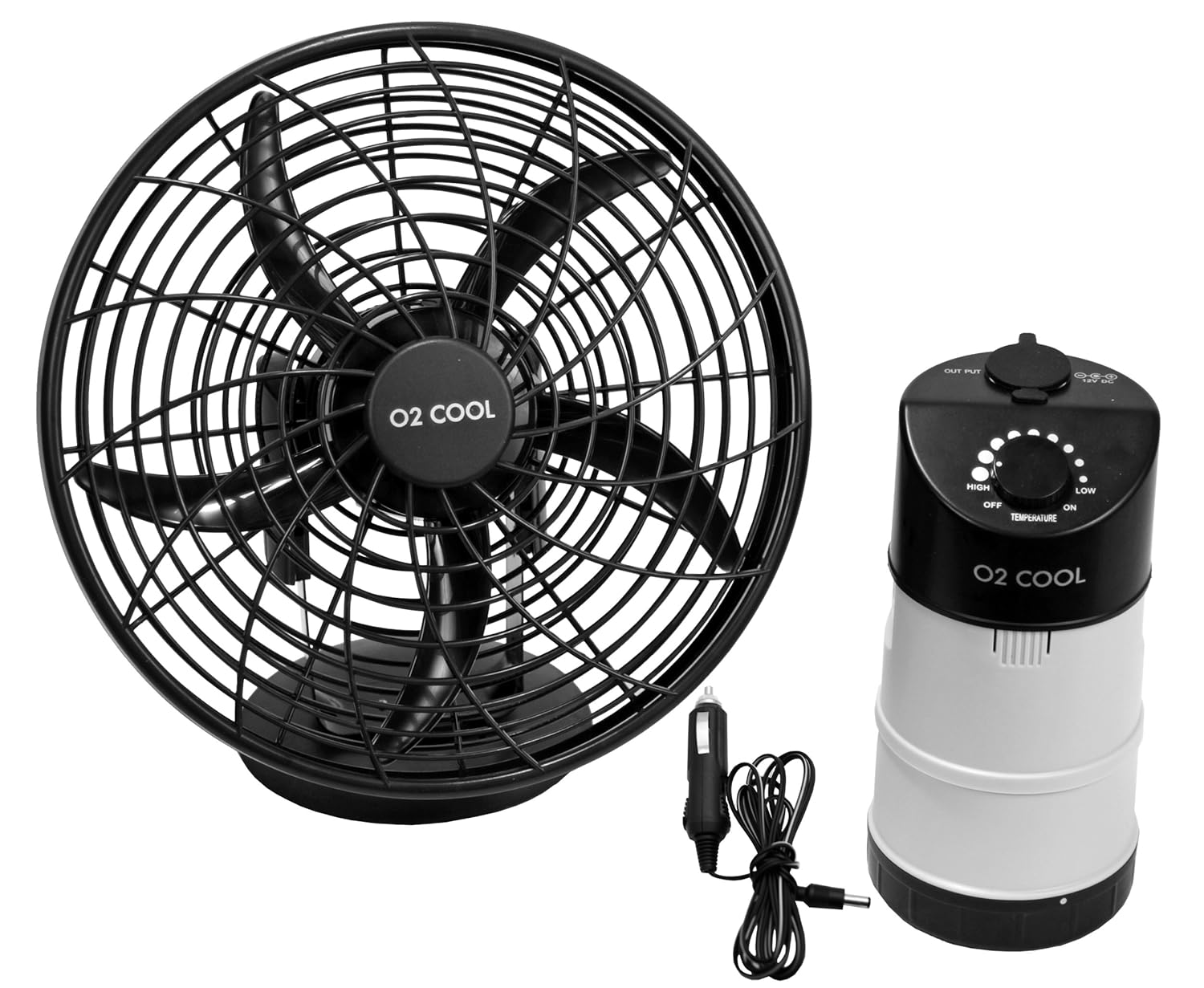 It has a stable base, a stand that adjusts in height, and rotates for the desired angle of elevation. The magnets are very strong that hold the fan to the base. This arrangement is chosen so the base can be removed and put outside the tent and the fan then secured back to it so the fan is suspended from the top or side of the tent. Another thing I really like is that the battery pack has a thermostat. You turn the control knob clockwise until you reach the setting you want, and if the air temperature drops during the night, the fan cuts off to save battery life. The only down side is the battery demand, but if you want more air and more power, it's reasonable that you'll have to pay for it. The pack takes eight D cell batteries, which run $12.88 at our local store, so the power-saving thermostate is doubly appreciated. They advertise a battery life of 72-hours, so I'm only taking one set of replacement batteries to get me through the week. If it is used in a vehicle, it just runs directly off the cigarette lighter plug.